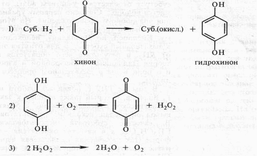 Органические соединения могут окисляться и другим способом благодаря отнятию водорода. Еще Бах, сделав упор на перекисную теорию, выдвинул и вторую гипотезу, согласно которой биологическое окисление связано с отнятием от субстрата электронов и протонов. Роль же кислорода состоит в этом случае в регенерации окисленного состояния первичного акцептора водорода. По Баху, последовательность реакций в процессе могла бы выглядеть следующим образом: