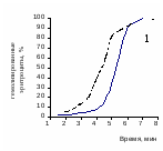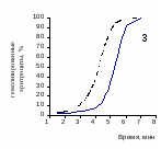 Первоначальное распределение по степеням стойкости к гемолитику эритроцитов интактных крыс отражает исходная эритрограмма. Согласно графику, процесс разрушения эритроцитов начинается через 1,5 минуты после добавления к их взвеси гемолитика, наибольшей интенсивности достигает к 3,5 минутам и заканчивается через 7,5 минут.
