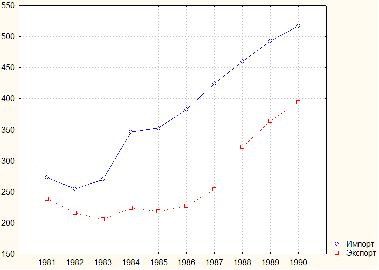 В данной курсовом проекте анализируются два динамических ряда – показатели объёмов экспорта и импорта США в период с 1977 по 2007 гг..