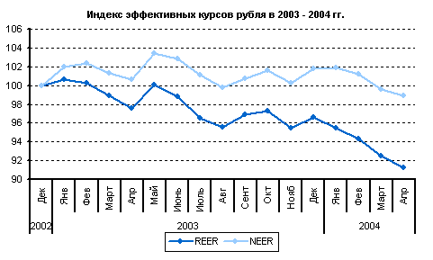 За период с начала 2004 г. по апрель номинальный эффективный обменный курс рубля, согласно нашим расчетам, увеличился на 2,8%. Одновременно, по отношению к декабрю 2002 г. увеличение составило 1,1%. Такая ситуация объясняется, с одной стороны, незначительным снижением номинального эффективного курса по итогам 2003 г., а с другой – укреплением в начале 2004 г. Номинальный эффективный обменный курс рубля представляет собой среднее соотношение, по которому российская валюта обменивается на валюты стран-основных внешнеторговых партнеров. В расчет, проводимый РЭО, принимаются валюты 12 стран, доля которых во внешнеторговом обороте России составляет 56,4%.