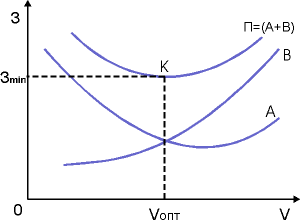 На рис. 2.1 показана зависимость внутрипроизводственных затрат (А), внепроизводственных (В) и полных затрат (П=А+В) от объема выпускаемой продукции. Оптимальный размер предприятия достигается при минимуме полных затрат на выпуск продукции. На рисунке этот минимум обозначен точкой К.