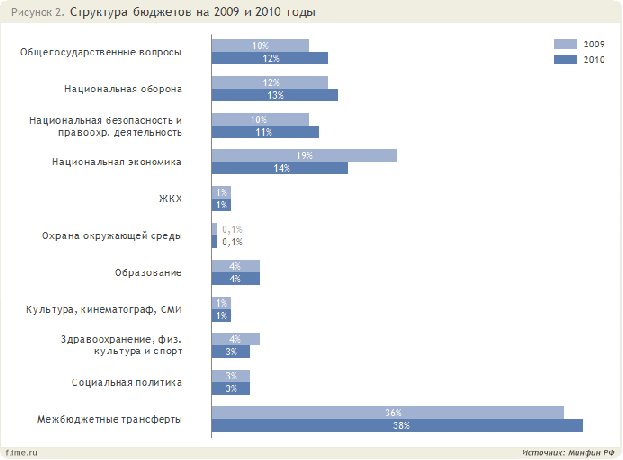 Общая картина ясна: расходы бюджета-2010 незначительно отличаются от расходов-2009. При этом в структуре бюджета-2010 значительно выросли показатели общегосударственных расходов и межбюджетных трансфертов (за счет увеличения трансфертов пенсионному фонду), а также умеренно выросли расходы на национальную оборону и национальную безопасность (+3,4% и +5,6%). При практически неизменном общем объеме расходов бюджета-2010 в сравнении с бюджетом-2009 для финансирования вышеприведенных увеличившихся расходов были значительно сокращены расходы на национальную экономику (-500 млрд., или -27%), трансферты другим бюджетам (кроме трансфертов пенсионному фонду РФ), а также умеренно (в пределах 4—9%) были сокращены другие статьи расходов: на ЖКХ, образование, здравоохранение, культуру и т. д.