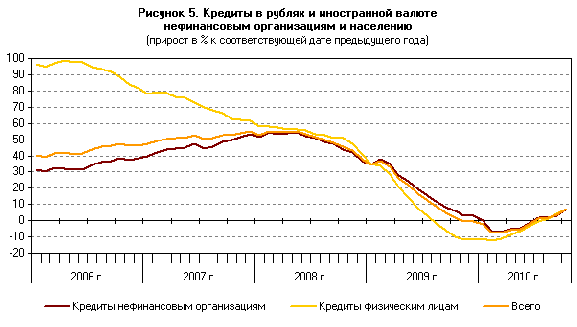 В III квартале 2010 г. продолжился рост задолженности по всем категориям кредитов, за исключением валютных кредитов физическим лицам. Прирост задолженности нефинансовых организаций составил 4,4% по рублевым кредитам и 5,1% по валютным, а задолженности по рублевым кредитам физических лиц — 6,6%. Задолженность физических лиц по валютным кредитам сократилась на 4,5%. В результате годовые темпы прироста общей задолженности по кредитам на 1.10.2010 составили 7,1%.