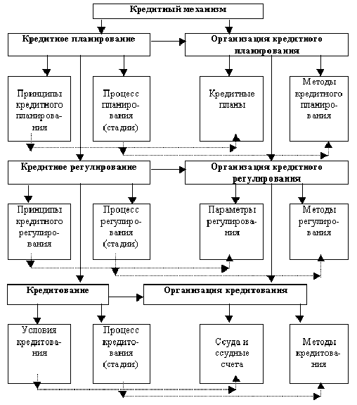 В частности, целями инвестиционного механизма могут быть достижение определенного экономического или социального эффекта, а в качестве технологической основы инвестирования и управления инвестициями могут быть использованы либо традиционные, либо передовые достижения НТП, в том числе Интернет-технологии. В то же время ряд отечественных ученых-экономистов, среди которых Н.Д. Барковский, Н.И. Валенцева, И.Д. Мамонова, С.В. Штейншлейгер, В.В. Земсков, дополнили такую разновидность инвестиционного механизма, как кредитный механизм, элементами кредитного процесса, назвав в качестве составляющих принципы и способы планирования, организации и контроля за выдачей кредита, а кредитный механизм в интерпретации В.В. Земскова (см. рис. 3) представляет собой попытку исследовать механизм не только как составную часть системы экономических отношений, но и как процесс, отождествив их*. По нашему мнению, отличие инвестиционного процесса от инвестиционного механизма заключается в том, что содержание первого понятия определяется как последовательность действий, этапов, процедур, тогда как механизм есть своего рода вневременная абстрактная схема реализации этого процесса.