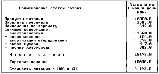 Определим приблизительную себестоимость одного койко-дня за год. Она определяется отношением затрат за год к проведенным койко-дням за этот же период. Общее количество койко-мест, функционирующих в данном году, 137 (100 - "Горный воздух", 25 - "Воронцовский приют", 12 - "Лунная поляна"). Период их функционирования июль - декабрь, то есть 184 дня. Таким образом, максимально возможное количество проведенных койко-дней за год - 25208 (137 койко-мест*184 дня). Расчетную величину затрат будем формировать следующим образом: 3947.7 млн.рублей - затраты по смете; 1700 млн.рублей - затраты по проекту, списываемые в данном году с учетом срока окупаемости проекта 5 лет. Итак, общая величина затрат для расчета себестоимости одного койко-дня 5647.7 млн.рублей. Сама себестоимость будет равна 224 тыс.рублей. Продажная цена будет включать в себя норму прибыли (наценку), а также страховку в размере 1 доллара США.