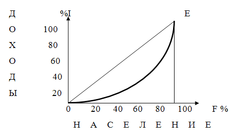 Если бы доходы у всех людей были одинаковыми, т.е. 1 % населения располагал 1 % доходов, 15 % населения — 15 % доходов, то кривая Лоренца заняла бы положение линии абсолютного равенства и превратилась в прямую. На рис. 1 теоретически абсолютно равное распределение доходов иллюстрирует линия ОЕ, ее угол наклона к оси абсцисс составляет 45°. Чем больше кривая Лоренца отклоняется от линии абсолютного равенства, тем более неравномерно распределены в обществе доходы. [2, с. 59]