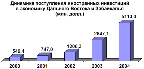 Доля Дальнего Востока и в общем объеме иностранных инвестиций в Российскую Федерацию в 2004 году составила около 16%. В 2004 году на Дальний Восток поступило 5113 млн. долл., что 1,8 раза превышает уровень 2003 года, из них прямые инвестиции – 3423,4 млн. долл.