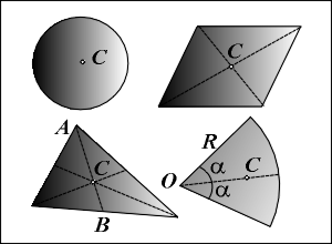 Центр тяжести лежит соответственно или на оси симметрии, или в центре симметрии