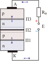 База и коллектор транзистора Т1 соединены соответственно с базой и коллектором транзистора Т2, образуя цепь внутренней положительной обратной связи. Если к аноду тиристора подключить плюс источника питания, а к катоду – минус, то переходы П1 и П3 будут смещены в прямом, а П2 – в обратном направлении. Таким образом напряжение источника питания окажется приложенным к переходу П2 и будет определяться выражением I=Iк0 / [1 – (α1+α2)], где Iк0 – обратный ток перехода П2, α1 и α2 – коэффициенты усиления. Из выражения следует, что ток I зависит от α1 и α2 и резко возрастает, когда их сумма приближается к единице. Коэффициенты α1+α2 зависят от тока эмиттера, напряжения на коллекторном переходе и ряда других факторов.
