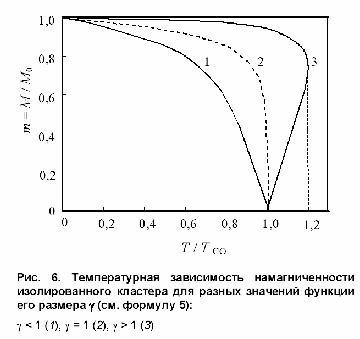 Как видно из рис.6, уменьшение намагниченности с ростом температуры происходит по-разному в зависимости от размера кластера ( функции). Если размер кластера так велик, что значение , то зависимость однозначна и описывает переход второго рода. Если же кластер настолько мал, что , то зависимость приобретает Z-образную форму. В этом случае при понижении температуры переход на нижнююветвь зависимости будет происходить скачко (см. пунктир на рис. 3), что характерно для фазовых переходов первого рода. Если обозначить температуру перехода, при которой происходит изменение типа фазовогоперехода, , т.е. полагать , то критический размер кластера, характерный для данной температуры, может быть рассчитан по формуле