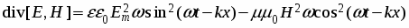 Для анализа нам вполне достаточно рассмотреть, как выполняется выражение (3) для плоской монохроматической ЭМ волны, полевые компоненты которой, согласно волновым решениям уравнений Максвелла, в свободном пространстве без потерь при распространении совершают синфазные колебания: и . Подставляя эти выражения в соотношение (3), окончательно получаем: