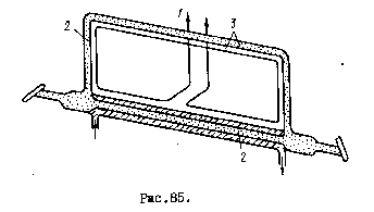 Многочисленные исследования ионных аргоновых ОКГ привели к оригинальному решению проблемы создания дугового разряда высокочастотными поляки. На рис.85 приведена схема аргонового ОКГ с высокочастотным питанием < . Замкнутая кольцевая трубка 2 ОКГ служит как бы одновитковой вторичной обмоткой высокочастотного трансформатора 3 . Для питания используется генератор с частотой в несколько мегагерц. Высокочастотное возбуждение имеет следующие достоинства: снижается эрозия кварцевого капилляра, отсутствует жестчение газа, существенно уменьшаются шумы в излучении. Уменьшение эрозии, по-видимому, связано с тем, что ионы не успевают приобрести значительную скорость при движении в высокочастотном поле. В ОКГ с высокочастотным возбуждением нет металлических электродов, что позволяет использовать в них химически активные газы (в таком разряде получена генерация на ионах мышьяка, брома, селена).