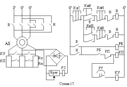 Работа схемы при реверсе АД : Нажимаем кнопку Н, отключаем контактор В, КП, КУ и РБ. После замыкания нормально замкнутых контактов контактора В в цепи катушки контактора Н (электрическая блокировка), включаем контактор Н, начинается электрическое торможение противовключением АД. При этом в роторной цепи АД включены все резисторы (Rу + Rп), т.к. реле РП сработало и блокировало включение контактора КП. При скорости ротора, близкой к 0, отпадает якорь РП и замыкает свой нормально замкнутый контакт в цепи питания КП, при срабатывании которого закорачивается Rп в цепи ротора АД. Начинается разгон АД в обратном направлении с введенным реостатом Rу под контролем реле времени РУ (смотреть работу схемы при пуске). При нажатии кнопки С АД отключается от сети и тормозится только под действием статического момента.