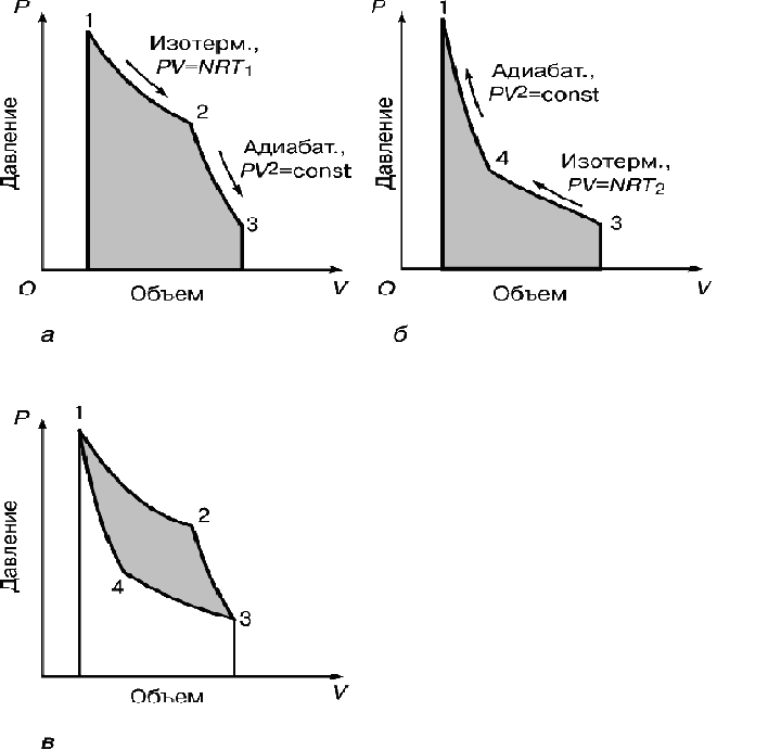 Рис. 3. ЦИКЛ КАРНО на диаграмме объем – давление. Площади, выделенные ретушью: а – работа, совершаемая газом; б – работа, совершаемая над газом; в – разность площадей а и б, равная полезной работе, совершаемой машиной.