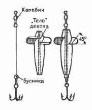Устройство этой снасти мало отличается от обычных донок с амортизаторами: резиновая нить длиной 20–25 м привязывается к основной леске (диаметр 1–1,2 мм, длина 100 м); крючки № 12 на коротких, не более 40 см, поводках. Растояние между поводками 1,5 м, толщина поводка — 0,5 мм. Вываживание жереха при ночной ловли затруднений не доставляет, и можно использовать более тонкие лески, но толстые меньше путаются.
