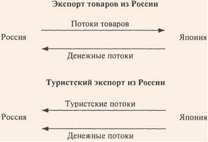 Итак, туристский экспорт - это вывоз из страны туристских впечатлений, который сопровождается одновременным ввозом туристом денег в данную страну. Туристский импорт - это ввоз в страну туристских впечатлений, который сопровождается одновременным вывозом туристом денег из данной страны. Рис. 1.1. наглядно иллюстрирует данный подход. Когда туристы из России совершают путешествие в Японию, это становится туримпортом в экономику России. Деньги японских туристов, потраченные в России, являются туримпортом для японской экономики.