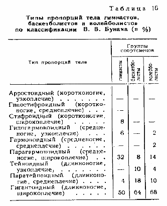 Соответственно классификации В.В. Бунака, среди гимнастов, баскетболистов и волейболистов встречаются спортсмены с различным типом пропорций тела, при этом наиболее часто отмечается гигантоидный тип (табл. 16).