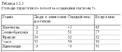 У міжнародному туризмі зустрічаються люди з різним достатком. У туристських потоках майже усіх країн переважають представники середнього класу: від 40 % в Нідерландах до 59 % в Італії. Люди з невисоким достатком займають значне місце в туристичному потоці Франції (36 %) та Італії (31 %). Серед туристів із Німеччини (43 %), Нідерландів (41 %), Великобританії (37 %) провідне місце займають представники вищого класу, які пред'являють попит на найкомфортабельніші умови розміщення. Щоправда, багато з представників цього класу мають власні будинки.