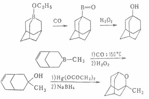 Р-ция R3B с изонитрилами приводит к 2, 5-диборадигидропиразинам (при 150°С), к-рые при нагр. до 200°С (или в присут. протонных р-рителей) изомеризуются в 2, 5-диборапиперазины, что применяется для получения кетонов и третичных спиртов.