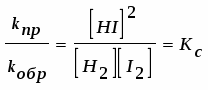 Например, допустим, что необходимо вычислить равновесную концентрацию HI, получающуюся в результате реакции Н2 + I2 ↔ 2HI. Обозначим исходные концентрации Н2 и I2 через С, а их изменение к моменту равновесия через х (моль/л). Тогда равновесные концентрации реагентов составляют: