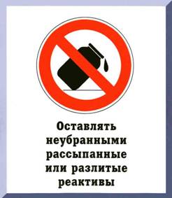 обо всех разливах жидкостей, а также о рассыпанных твердых реактивах;