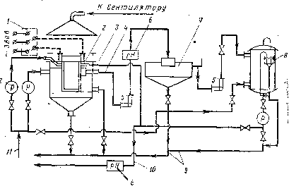 На рис. 1 показан термоумягчитель конструкции Копьева, отличающийся относительной простотой устройства и надежностью работы. Предварительно подогретая в аппарате обрабатываемая вода поступает через эжектор на розетку пленочного подогревателя и разбрызгивается над вертикально размещенными трубами, и по ним стекает вниз навстречу горячему пару. Затем совместно с продувочной водой от котлов она по центрально подающей трубе через дырчатое днище поступает в осветлитель со взвешенным осадком.