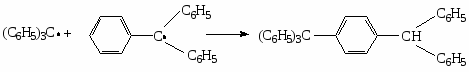 При автокаталитической конденсации (под влиянием соленой кислоты) свободных триарилметильных радикалов по Чичибабину происходит образование n-бензгидрилтетрафенилметана, т.е. происходит радикальное замещение в пара-положение: