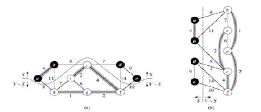 На Рис показано на примере минимальное покрывающее дерево. На каждом ребре графа указан вес. Выделены ребра минимального покрывающего дерева (суммарный вес 37). Такое дерево не единственно: заменяя ребро (Ь, с) ребром (а,h), получаем другое дерево того же веса 37.