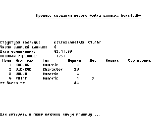 Кроме того, необходимо предоставить пользователю возможность облегчить процесс создания файла данных, т.е. предусмотреть создание файла данных со структурой заданной в программе, а не выбираемой самим пользователем, что полностью исключит возможные ошибки пользователя в задании имен полей файла данных, что в сою очередь может сказаться на корректной работе всей программы.