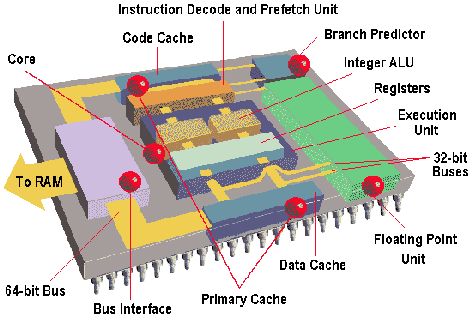 Буфер Ветвлений (BTB) обеспечивает динамическое предсказание ветвлений. Он улучшает выполнение инструкций запоминанием способа ветвления и применением той же ветви при следующем выполнении инструкции. Когда BTB делает правильное предсказание, производительность увеличивается. 80-точечный Модуль Плавающей Точки обеспечивает арифметическое средство для обращения с "вещественными" числами.