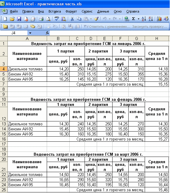 1. В табличном процессоре MS Excel созданы таблицы с данными о затратах на приобретение ГСМ по месяцам в соответствии с методическими указаниями. Введены все исходные данные, необходимые для дальнейшего расчета (рис.3).
