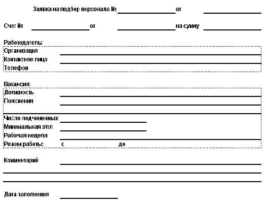 Ввод и хранение заявок на подбор персонала от клиента-работодателя кадровому агентству. Заявка содержит сведения о клиенте-работодателе, требования к кандидату, должностные обязанности, пожелания и т.д.