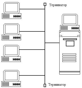 Такая сеть похожа на центральную линию, к которой подключены сервер и отдельные рабочие станции. Такое соединение получило широкое распространение, что, прежде всего, можно объяснить небольшими потребностями в кабеле и высокой скоростью передачи данных.