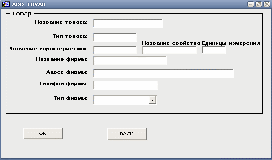 В появившемся окне необходимо ввести ВСЕ поля, иначе добавления товара не представляется возможным. Заполнив все поля и нажав кнопку «OK», пользователь внесет товар в базу данных. Для отмены действия добавления товара, пользователю необходимо нажать клавишу «Back», при этом он, пользователь, вернется в свое основное окно.