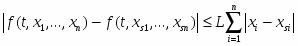 Общим решением системы (1) в области G называется совокупность n функций xi=xi(t,c1,…,cn), i=1,2,…,n. Будем говорить, что функция f(t,x1,…,xn) удовлетворяет условию Липшица в области G по переменным x1,…,xn, если существует такое постоянное число L>0, что для любой пары точек (t,x1,…,xn) и (t, xs1,…,xsn), принадлежащих G, выполняется неравенство