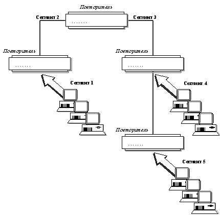 На рисунке 5 показан пример сети, состоящей из двух сегментов, соединенных одним повторителем.