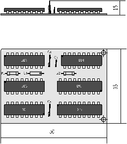 Печатная плата односторонняя, размеры 50 Х 35 мм, располагается внутри корпуса размером 62 Х 45 Х 25. Плата крепится к основанию корпуса с одной стороны на два винта, а с другой стороны край платы упирается в специальный выступ в корпусе.