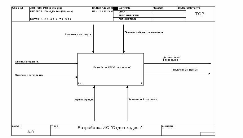Объектом управления является отдел кадров, который предоставляет всю информацию о персонале. Сотрудники предоставляют сведения о себе, при этом заполняются анкета и заявление и в конечном итоге составляется трудовой договор с Институтом, подписываемый администрацией. Вся предоставленная информация хранится в Отделе Кадров.
