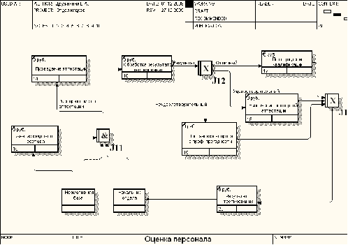 Модель представляет систему в виде контекстной диаграммы – одной работы «Деятельность отдела кадров» и дуг, изображающих интерфейсы с функциями вне системы. Эта работа декомпозируется на последующих диаграммах: «Прием и увольнение сотрудников», «Оценка персонала», «Делопроизводство по кадровым вопросам», «Бухгалтерское обеспечение».