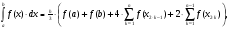 Начало ПП S = INTEGR( a, XJ, EPS, ZN, ZK ) I1 = 1 K = 1 I2 = 0 H = ( ZK - ZN ) / K I = 2 Z2 = ZN + I*H, Z1 = Z2 - H, Z0 = Z1 - H L2 = ln( XJ + a*Z2 ), L1 = ln( XJ + a*Z1 ), L0 = ln( XJ + a*Z0 ), I2 = I2 + L0 + 4*L1 + L2 да I<=K I = I + 2 да | I1 - I2 | < EPS I1 = I2 K = 2*K INTEGR = I2 возврат