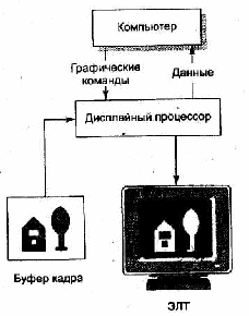 Дисплейний процесор приймає графічні команди від додатку, перетворює їх в точкове зображення, або растр, після чого зберігає растр в розділі пам’яті, який називається буфером кадру (frame buffet) (рис. 4).