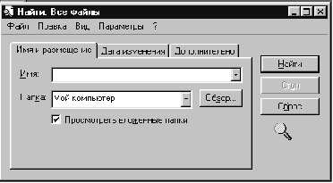 Для того, чтобы найти объект в Windows 95, хорошо бы знать его имя и примерное место размещения, а если дополнительно к этому вы знаете приблизительную дату или интервал времени, когда он был создан, то поиск будет проходить еще быстрее. На худой конец, нужно знать хотя бы несколько букв из его имени или два-три слова из текста документа (если вы ищете именно текстовый документ).