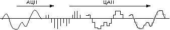 Из физики известно, что звук – это колебания воздуха. Если преобразовать звук в электрический сигнал (например, с помощью микрофона), то видно плавно изменяющееся с течением времени напряжение. Для компьютерной обработки такой – аналоговый – сигнал нужно каким-то образом преобразовать в последовательность двоичных чисел. Делается это, например, так – измеряется напряжение через равные промежутки времени и полученные значения записываются в память компьютера. Этот процесс называется дискретизацией (или оцифровкой), а устройство, выполняющее его – аналого-цифровым преобразователем (АЦП).