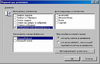 Существует возможность автоматической записи сведений о работе Outlook и данных о файлах, созданных любым приложением Office. Каждая запись Дневника содержит сведения об одной операции (создание документа, ответ на запрос, сообщение электронной почты и т.п.). Виды деятельности, автоматически заносимые в Дневник, можно установить в диалоговом окне Параметры дневника (рис.18), выбрав команду Параметры в меню Сервис.