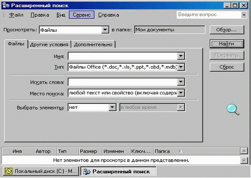 В Outlook можно задавать поиск любых файлов по заданным условиям, выбрав команду Расширенный поиск в меню Сервис. После нажатия кнопки Найти отобранные элементы выводятся в области Результат поиска (рис.24).