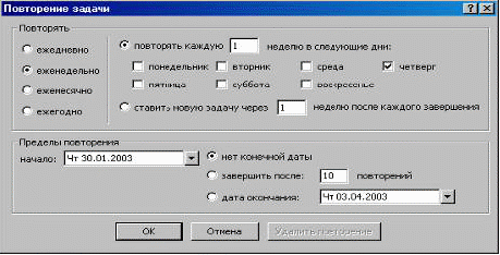Нажмите кнопку Повторение. Раскроется диалоговое окно Повторение задачи (рис.16).
