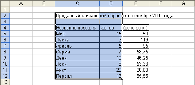 Таблица 1. Проданный стиральный порошок в сентябре 2003 года.