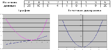 Точечные диаграммы используются и в том случае, если Вы хотите построить график какой-либо неоднозначной функции или функции, аргумент которой имеет непостоянный шаг. Построим, для примера, график функции y = x2, -5 <= x <= 5. Причем от -5 до 0 представим аргумент с шагом 1, а от 1 до 5 - с шагом 2. Если Вы выберете тип диаграммы Line (График), то по оси категорий будут отложены не значения аргумента, а некоторые равные интервалы и, следовательно, график функции будет отображен неверно. Если же Вы определите тип диаграммы как XY Scatter (Точечная), Вам будет предоставлена возможность выбора значений для оси категорий, и, указав в этом качестве строку или столбец, в которых хранится ряд аргументов, Вы корректно построите требуемый график.