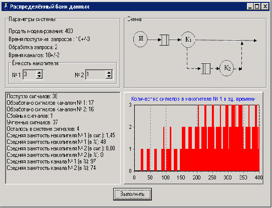 Смоделировать прохождение 400 запросов. Определить необходимую емкость накопителей перед ЭВМ, обеспечивающую безотказную работу системы, и функцию распределения времени обслуживания заявки.