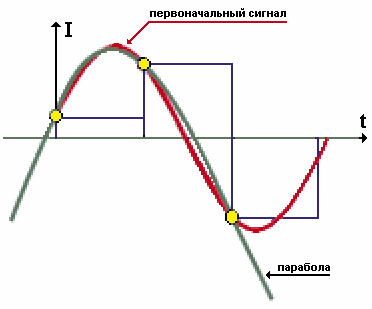 Видно, что на интерполируемом участке даже для параболы совпадение получается вполне удовлетворительное. Кроме того, технические возможности современных микросхем позволяют значительно увеличить степень полинома (многочлена), а вместе с ней и точность реконструкции формы сигнала.